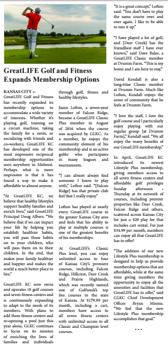 The regional golf and fitness group has added Deer Creek, Falcon Ridge and Wichita’s Tallgrass to its group of fourteen (14) GreatLifeKC courses.